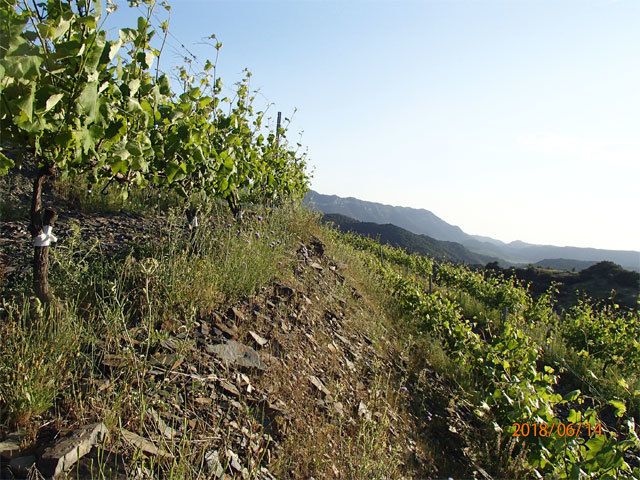 コンカデバルベラの平野部とプリオラートのちょうど間、モンサン山脈の標高850~ 900mの急勾配にブドウは植樹されており、直線距離7km先は銘醸地プリオラートです。土壌はそのプリオラートと同じネラル豊富なスレート土壌(粘板岩)。この地で稀少な雨はスレートを伝って地中深く落ち、ブドウの根はわずかな水分と養分を求めて深く伸びるため、独特のミネラル、凝縮感があるワインができます。また、反射作用も強く、光合成やブドウの成熟に大変良い効果をもたらしてくれます。 高標高に加えて、気候は大陸性気候で年間を通して雨が非常に少なく(平均約330ml/年)、四方を山に囲まれているので乾いた風が吹きます。ベト病の心配がない素晴らしい立地です。 さらに昼と夜の寒暖差は非常に大きく(例年、夏は最高33度、最低は15~18度)、酸を残しながらゆっくりとブドウが熟し実っていきます。